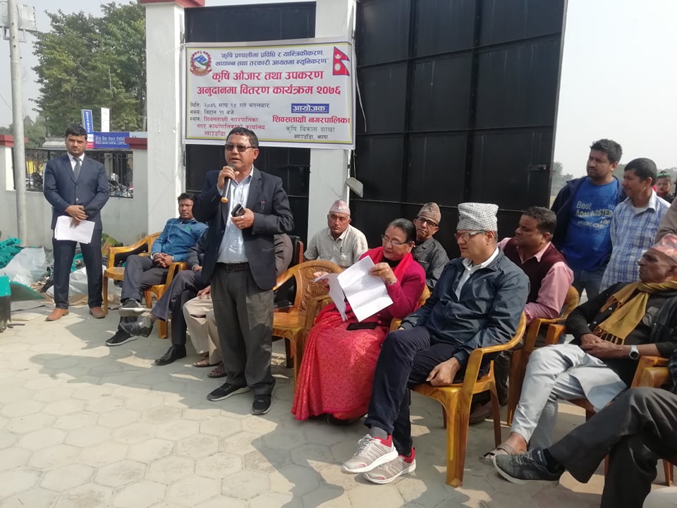 शिबसताक्षी नगरपालिकाले कृषिमा यान्त्रिकीकरण गर्ने उद्देश्यले कृषकलाई कृषि औजार वितरण गरेको हो । सो आवसरमा मकै छोडाउने मेसिन, पावर ट्रेलर, मकै रोप्ने मेसिन र स्प्रे ट्याङकी ५० प्रतिशत साथै साना सिंचाई मोटर सय प्रतिशत र रिपर मेसिन ७५ प्रतिसत अनुदानमा उपलव्धध गराएको छ । ९० लाख वजेट नगरपालिकाले यो वर्ष कृषिका लागि छुट्याएको नगरपालीकाको कृषि शाखाले जनाएको छ । नगर लाई खाद्य तथा तरकारी बालीमा आत्मानिर्भर बनाउन कृषि उपकरण बितरण गरेको नगर कृषि बिकास समितिका अध्यक्ष बलजित राईले बताउनुभयो । नेपाल सरकारले कृषि क्षेत्रमा ठुलो धनराशी खर्च गरेपनि परमपरागत रुपमा खेती गर्ने प्रणालीले गर्दा कृषकको जिवन स्तर उस्कन सकेको छैन । स्थानीय तहहरुले कृषिमा यन्त्रिकरण गर्नको लागी नगरमा आधुनिक उपकरण बितरण गरेको बरिष्ठ कार्यक्रम अधिकृत प्रकाश चौधरीको भनाई छ ।