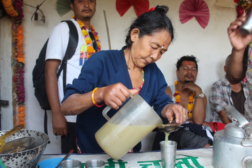 पहाडमा पाईने भोगटेबाट बनाईएको जुश ग्लासमा सार्दै महिला