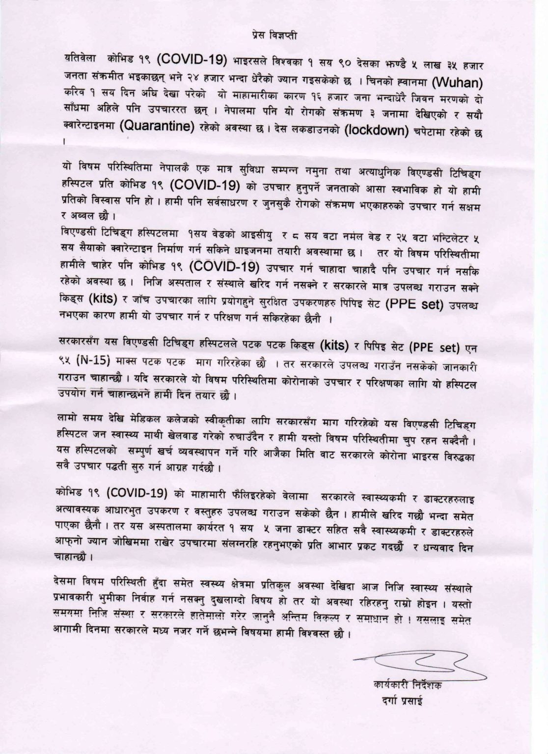 कोभिड १९ को माहामारी फैलिरहेको बेलामा सरकारले स्वास्थ्कर्मी र डाक्टरहरुलाई अत्यावश्यक आधारभुत उपकरण र वस्तुहरु उपलब्ध गराउन सकेको छैन । हामीले खरिद गछौ भन्दा समेत पाएका छैनौ । तर यस अस्पतालमा कार्यरत एक सय पाँच जना डाक्टरहरुले आफ्नो ज्यान जोखिममा राखेर उपचारमा संलग्नरहि रहनुभएकोप्रति आभार प्रकट गर्दछौं भनी जारी विज्ञप्तीमा उल्लेख छ ।