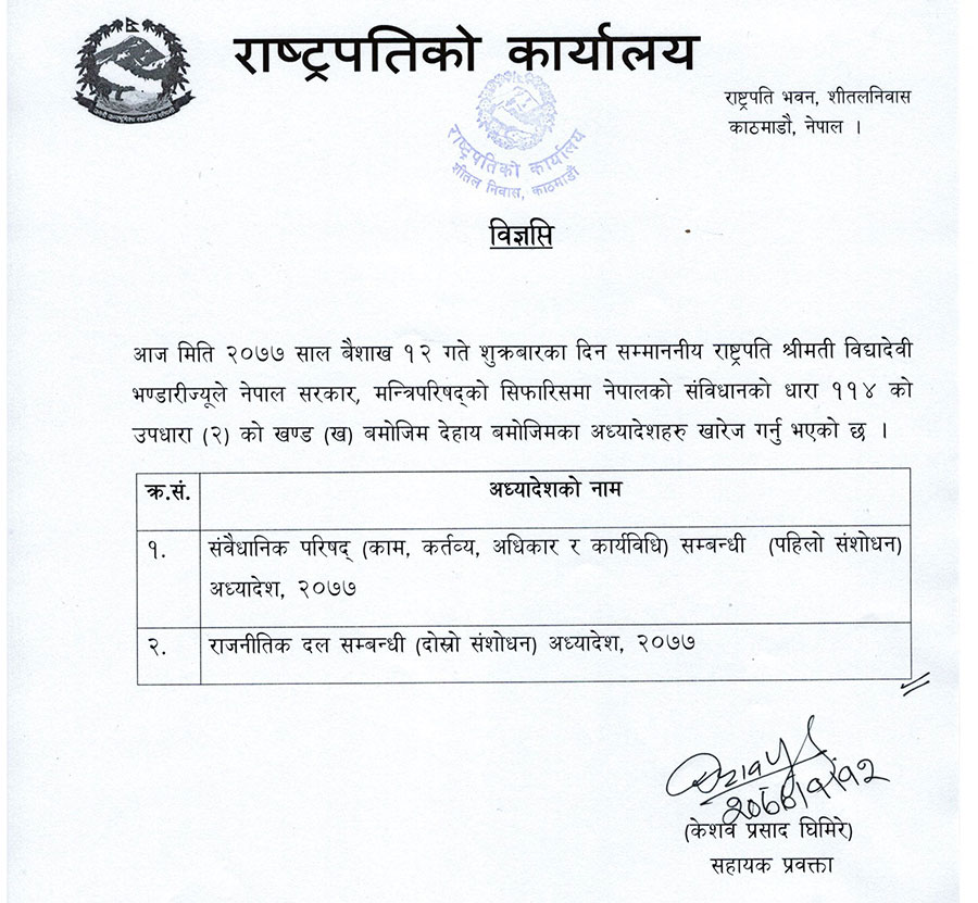 राष्ट्रपतिले संविधानको धारा ११४ को उपधारा (२) को खण्ड (ख) बमोजिम अध्यादेश खारेज गर्नुभएको हो । गत सोमबार मात्र राष्ट्रपतिले सोही अध्यादेश मन्त्रिपरिषद्को सिफारिसमा प्रमाणीकरण गर्नुभएको थियो ।