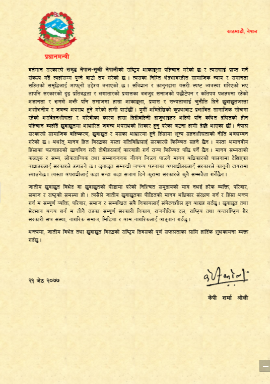 उहाँले जारी गर्नुभएको सन्देशमा भनिएको छ–‘मानव सभ्यताको कलंक र सभ्य, लोकतान्त्रिक तथा सम्मानजनक जीवन जिउन पाउने मावन अधिकारको पालनामा देखिएका बाधाहरुलाई सरकारले हटाउनेछ । छुवाछ ुतसम्बन्धी जघन्य घट्नाका अपराधीहरुलाई सरकारले कानूनी दायरामा ल्याउने छ । त्यस्ता अपराधीहरुलाई कडाभन्दा कडा सजाय दिने कुरामा सरकारले कुनै सम्झौता गर्द ैन् ।’