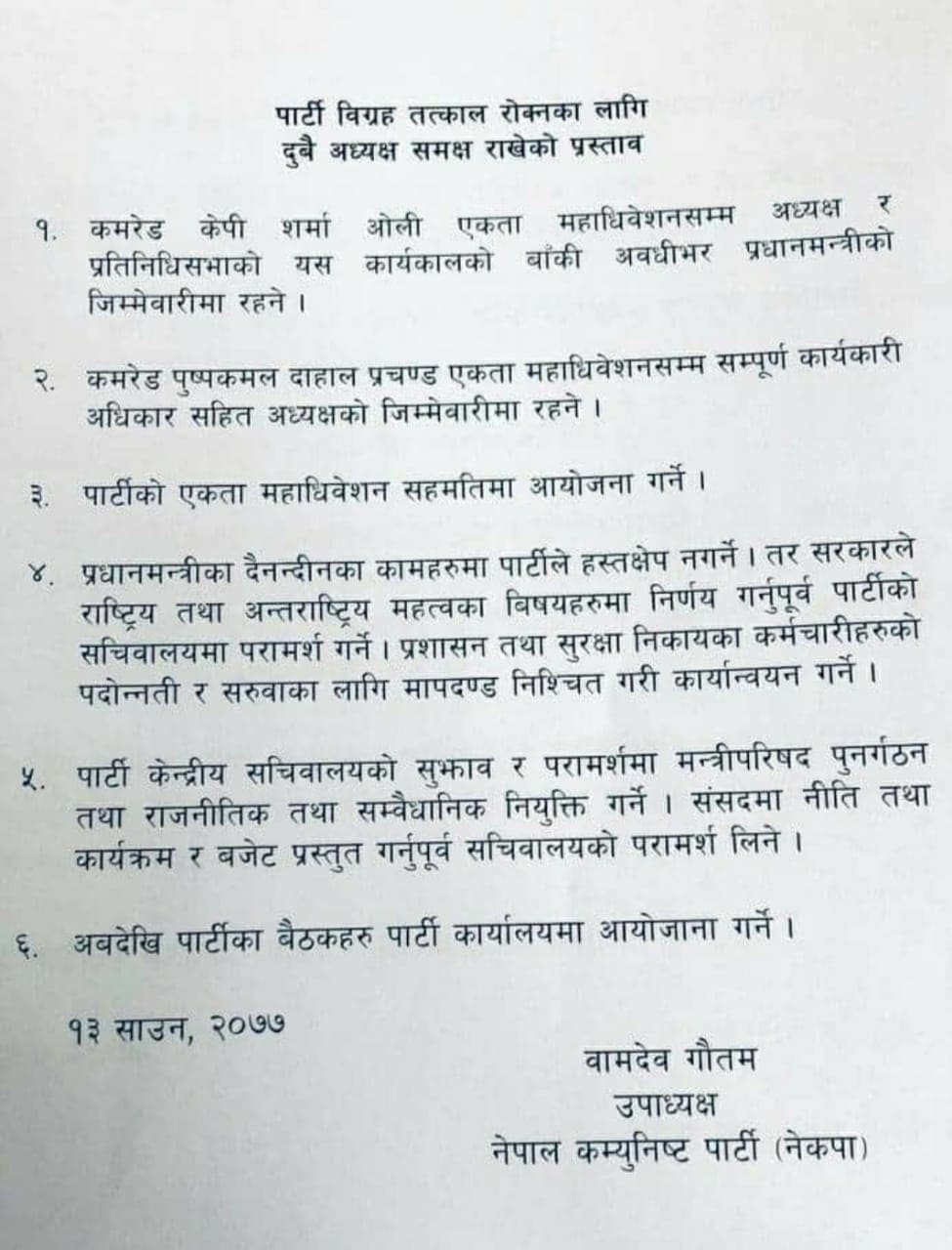 १३ श्रावण, काठमाण्डौँ । नेपाल कम्युनिस्ट पार्टी (नेकपा)का अध्यक्षद्धय केपी शर्मा ओली र पुष्पकमल दाहाल ‘प्रचण्ड’ बीचको टकराव उत्कर्षमा पुगेको बेला त्यस्लाई साम्य पार्न बामदेव गौतमले ६ बुँदे प्रस्ताव ल्याएका छन् ।