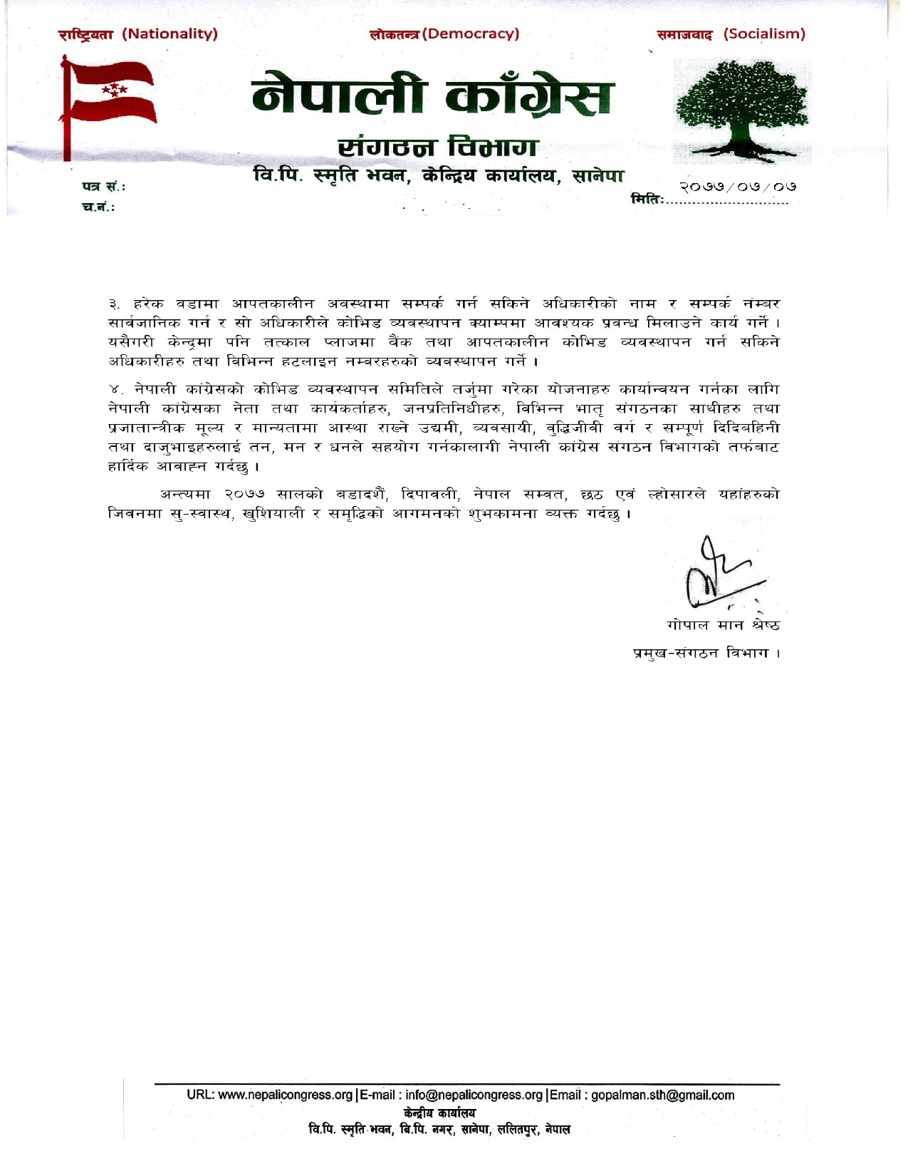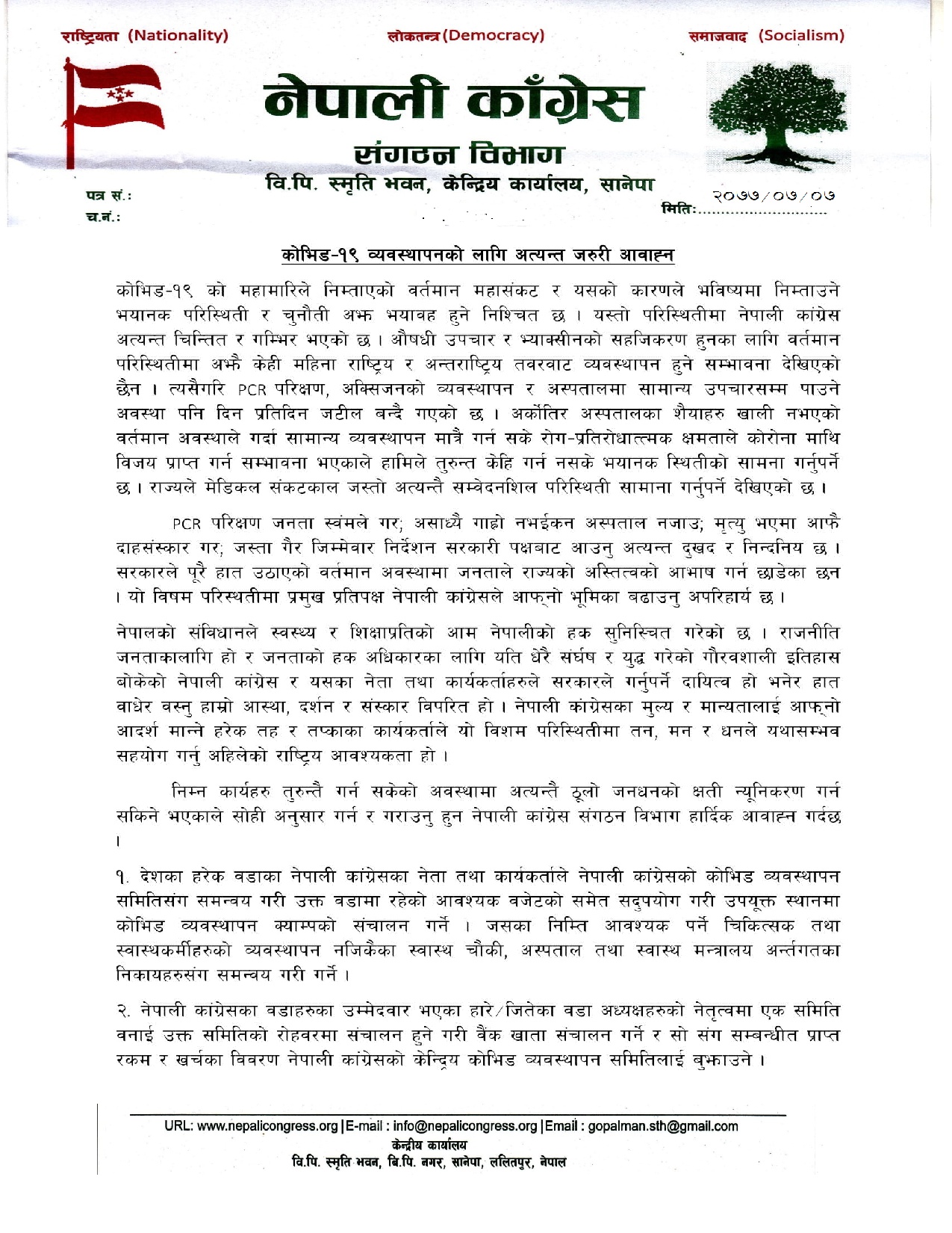 पीसीआर परीक्षण जनता स्वयंले गर, असाध्यै गाह्रो नभइकन अस्पताल नजाउ, मृत्यु भएमा आफै दाहसंस्कार गरजस्ता गैरजिम्मेवार निर्देशन सरकारी पक्षबाट आउनु अत्यन्त दुःखद र निन्दनीय कुरो रहेको संगठन विभाग प्रमुख गोपालमान श्रेष्ठद्वारा जारी विज्ञप्तिमा भनिएको छ । सरकारले पूरै हात उठाएको वर्तमान अवस्थामा जनताले राज्यको अस्तित्वको आभाष गर्न छाडेका छन्, यो विषम परिस्थितिमा प्रमुख प्रतिपक्ष नेपाली काँग्रेसले आफ्नो भूमिका बढाउनु अपरिहार्य रहेको कुरो उल्लेख गरिएको छ ।