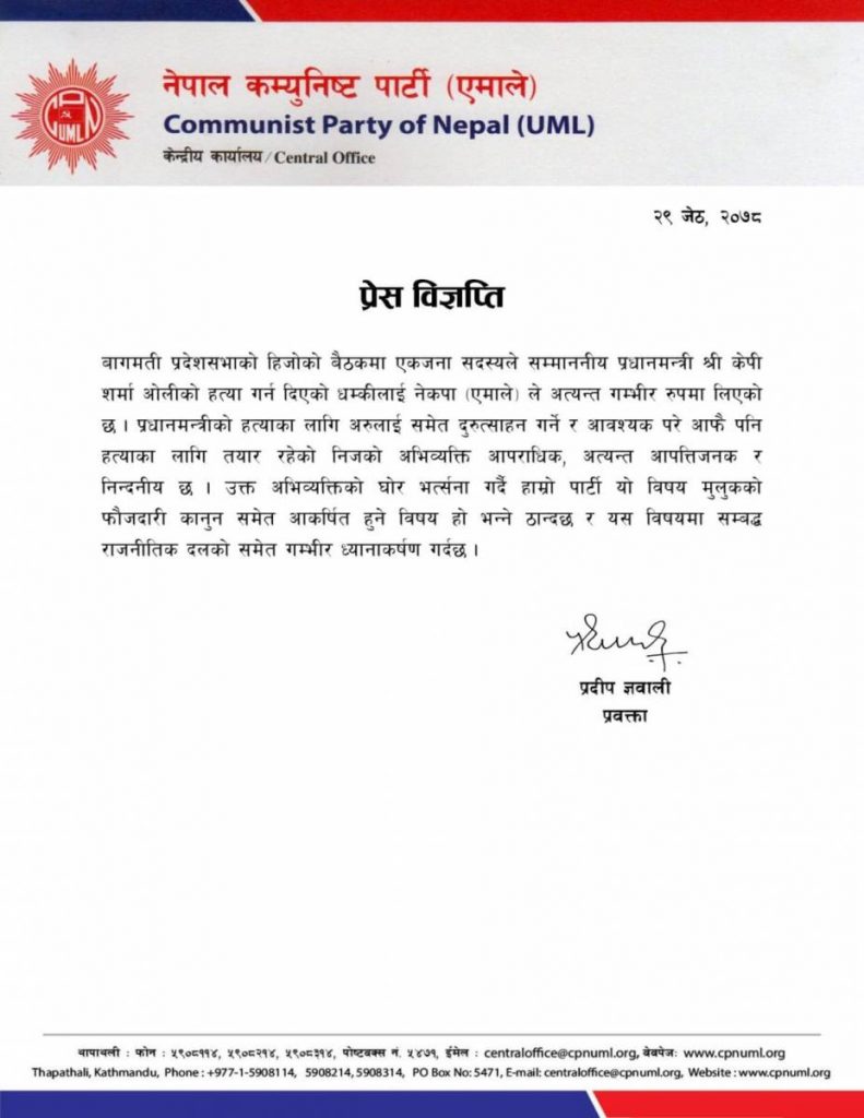 ज्ञवालीले प्रधानमन्त्री केपी शर्मा ओलीको हत्या गर्न तयार रहेको भन्ने वैद्यको अभिव्यक्तिलाई एमालेले अत्यन्त गम्भीर रुपमा लिएको र नीजलाई फौजदारी अभियोगमा कार्वाही गर्नु पर्ने उल्लेख गर्नुभएको छ । ‘उक्त अभिव्यक्तिको घोर भत्र्सना गर्दै हाम्रो पार्टी यो विषय मुलुकको फौजदारी कानुन समेत आकर्षित हुने विषय हो भन्ने ठान्दछ र यस विषयमा सम्बद्ध राजनीतिक दलको समेत गम्भीर ध्यानाकर्षण गर्दछ,’ विज्ञप्तिमा भनिएको छ ।