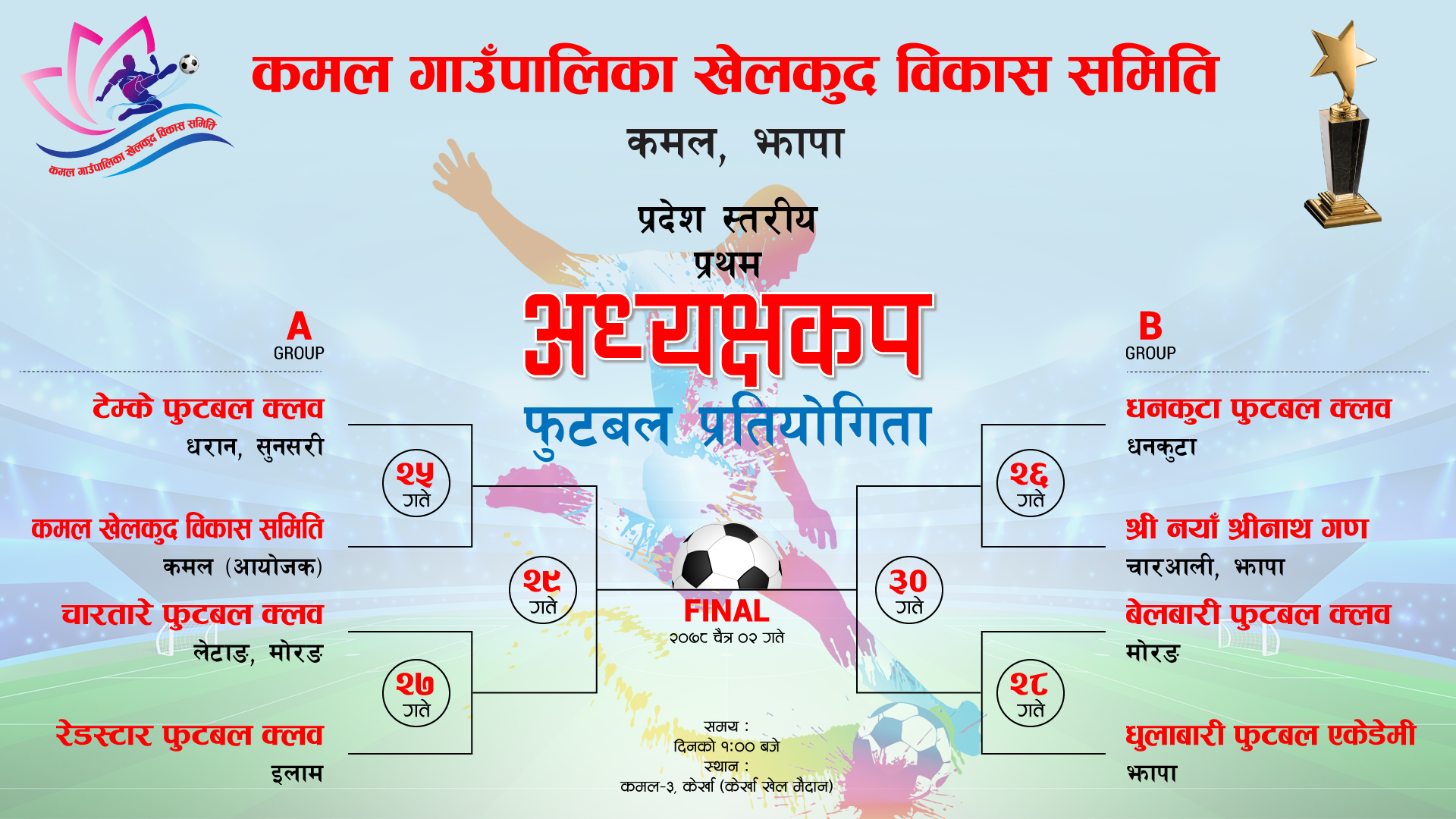 फागुन २५ गते देखि सुरु हुने अध्यक्षकपमा प्रदेशभरीका ८ वटा टिमको सहभागिता रहने आयोजक समितिले जनाएको छ । जस अन्तर्गत धनकुटा फुटबल क्लब धनकुटा, टेम्के फुटबल क्लब धरान, बेलबारी फुटबल क्लब मोरङ, चारतारे फुटबल क्लब लेटाङ, धुलाबारी फुटबल एकेडेमी झापा, रेड स्टार फुटबल क्लब इलाम, श्री नयाँ श्रीनाथ गण चारआली झापा र आयोजक टिम कमल गाउँपालिका खेलकुद विकास समिति झापा रहने जनाएको छ ।