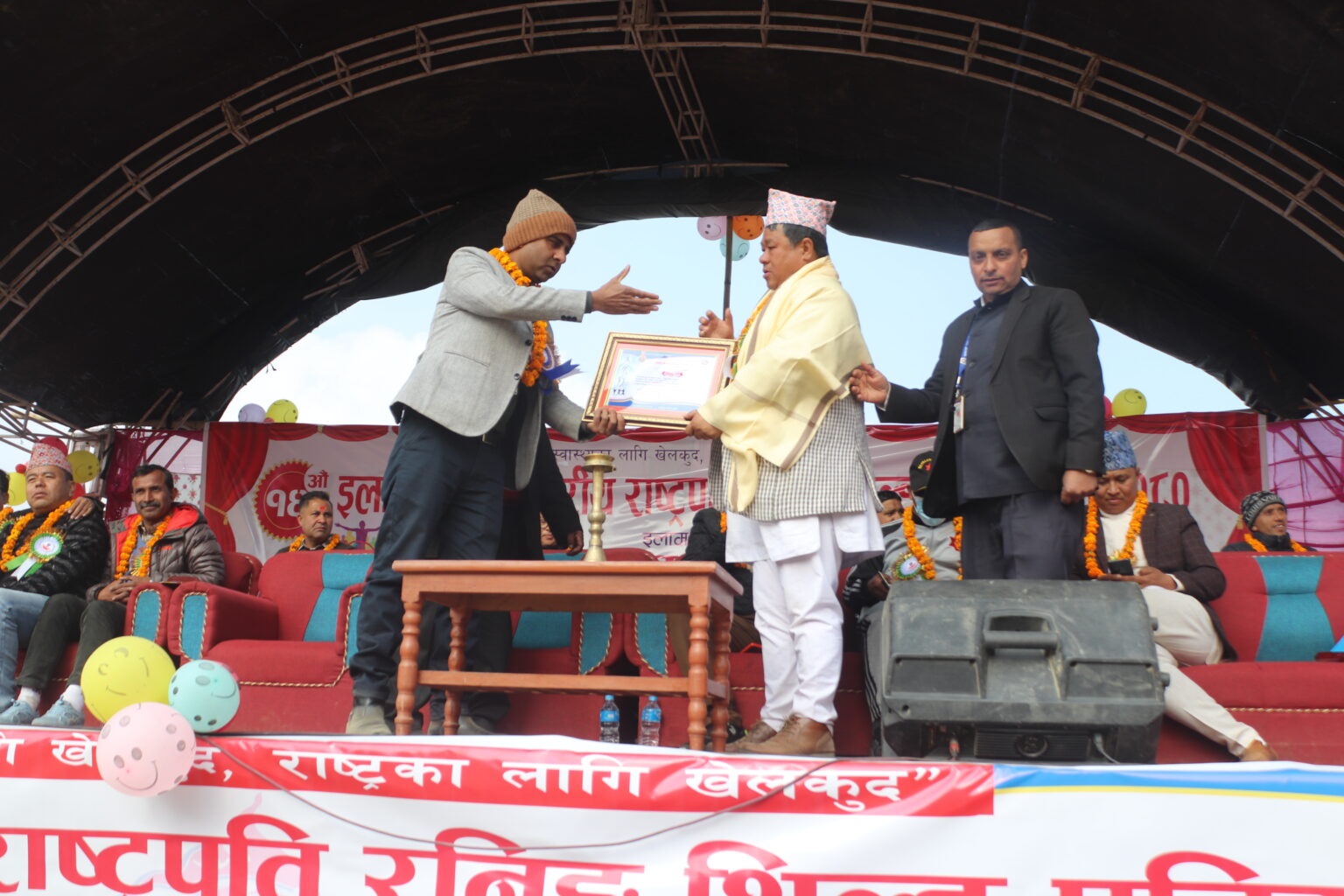 यस्तै माङसेबुङ गाउँपालिका अध्यक्ष राईले समेत १४ औं संस्करणको जिल्लास्तरीय राष्ट्रपति रनिङ शिल्ड प्रतियोगिता सञ्चालन गर्न गाउँपालिकाको तर्फबाट व्यवस्थापन गरेर सहयोग गरेको भन्दै सम्मान गरिएको बाँस्तोलाले जानकारी दिए । अध्यक्ष राईलाई पनि सोही कार्यक्रममा दोसल्ला र सम्मानपत्रसहित सम्मान गरिएको अध्यक्ष बाँस्तोलाले जानकारी दिए ।