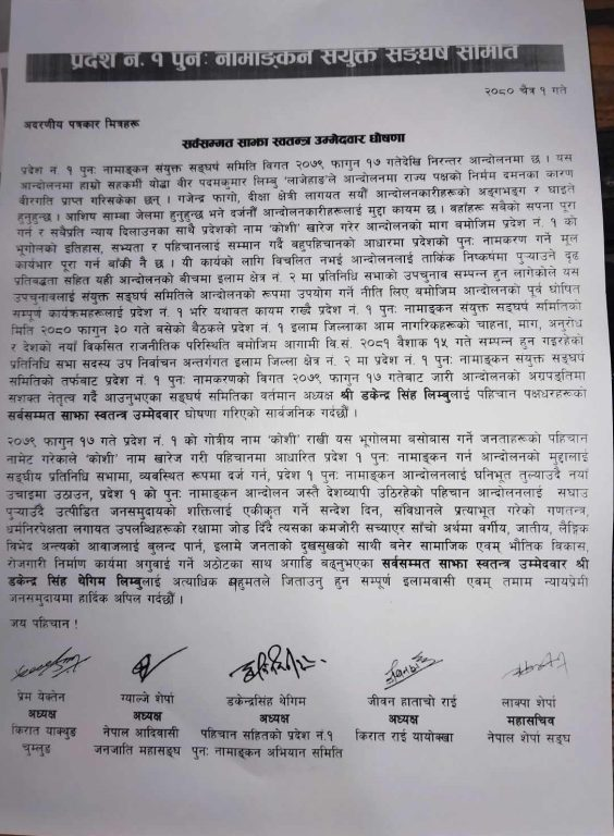 समितिले जारी गरेको विज्ञप्तिमा भनिएको छ, ‘इलाम जिल्ला क्षेत्र नं २ मा प्रदेश नं १ पुनः नामांकन संयुक्त संघर्ष समितिको तर्फबाट प्रदेश नं १ पुनः नामकरणको विगत २०७९ फागुन १७ गतेबाट जारी आन्दोलनको अग्रपङ्क्तिमा सशक्त नेतृत्व गर्दै आउनुभएका संघर्ष समितिका वर्तमान अध्यक्ष डकेन्द्रसिंह लिम्बूलाई पहिचान पक्षधरहरूको सर्वसम्मत साझा स्वतन्त्र उम्मेदवार घोषणा गरिएको सार्वजनिक गर्दछौं ।’