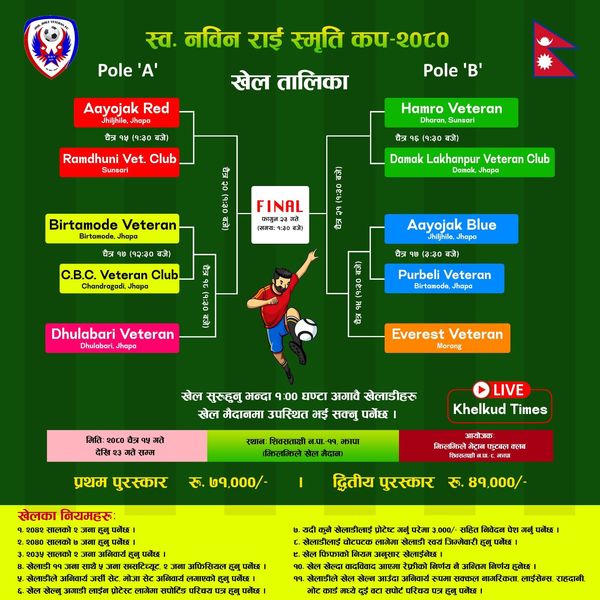 प्रतियोगिताको पहिलो खेलमा आयोजक रातो र रामधुली भेट्रान क्लब सुनसरीबिच हुने आयोजकले जनाएको छ । खेल चैत १५ गते गणेशमानसिंह प्रतिष्ठान खेलमैदान झिलझिलेमा १ः३० बजेबाट सुरु हुनेछ ।
