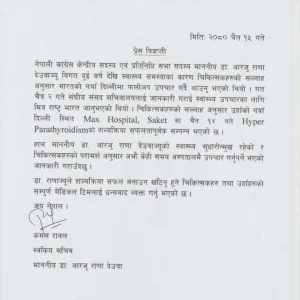 १५ चैत । नेपाली कांग्रेसकी केन्द्रीय सदस्य तथा प्रतिनिधिसभा सदस्य डा.आरजु राणा देउवाको हाइपर प्याराताइरोइडइजमको शल्यक्रिया सम्पन्न भएको छ । आरजु विगत दुई वर्षदेखि सो रोगको उपचार गर्दै आएकी थिइन् ।