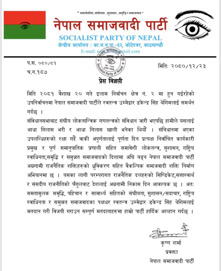 २३ चैत । नेपाल समाजवादी पार्टी (नेसपा)ले इलाम–२ मा डकेन्द्रसिंह थेगिमलाई समर्थन गर्ने भएको छ । डा. बाबुराम भट्टराई नेतृत्वको नेसपाले उपनिर्वाचनमा थेगिमलाई समर्थन गर्ने जनाएको छ ।