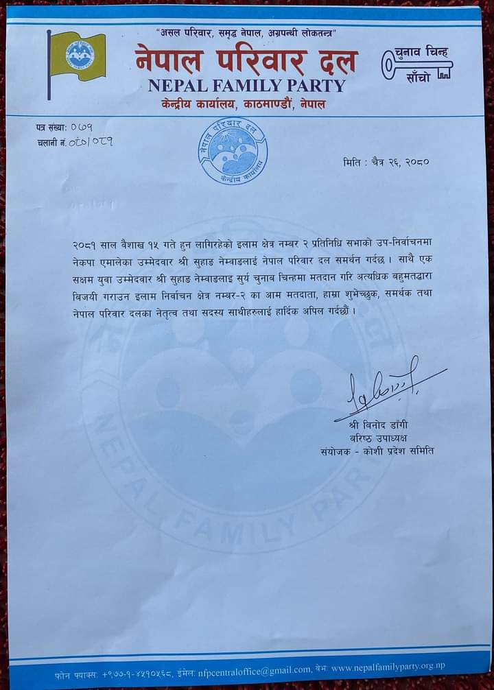 २८ चैत । आगामी वैशाख १५ गते इलाम–२ मा हुने उपनिर्वाचनमा नेपाल परिवार दलले नेकपा एमालेका उम्मेदवार सुहाङ नेम्वाङलाई समर्थन गर्ने भएको छ।