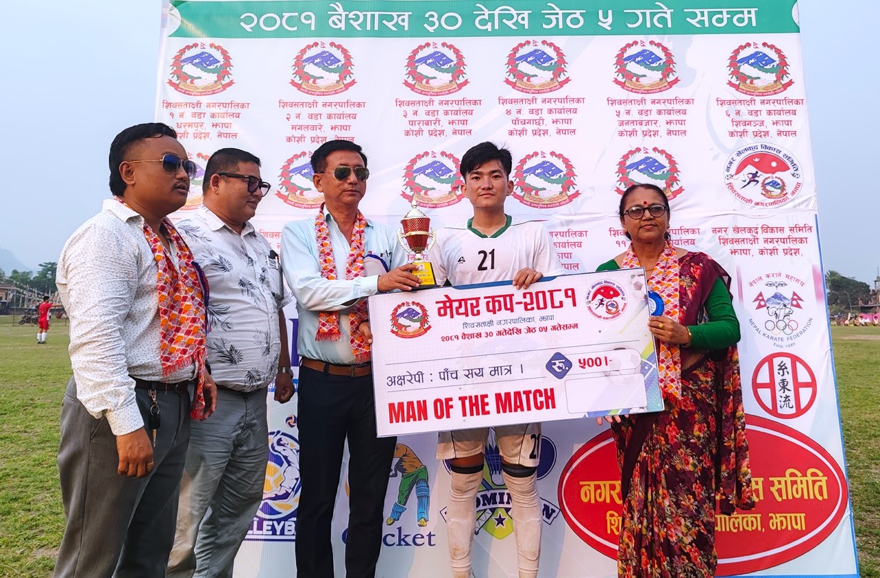 ५ जेठ, शिवसताक्षी । झापाको शिवसताक्षीमा जारी मेयर कप फुटबलमा वडा नं. ११ र वडा नं. ८ फाइनलमा प्रवेश गरेका छन् । शुक्रबार भएको सेमी फाइनल खेलमा मिनी भेट्रान क्लबलाई ५–१ गोल अन्तरले हराउँदै वडा नं. ११ फाइलनमा प्रवेश गरेको हो ।