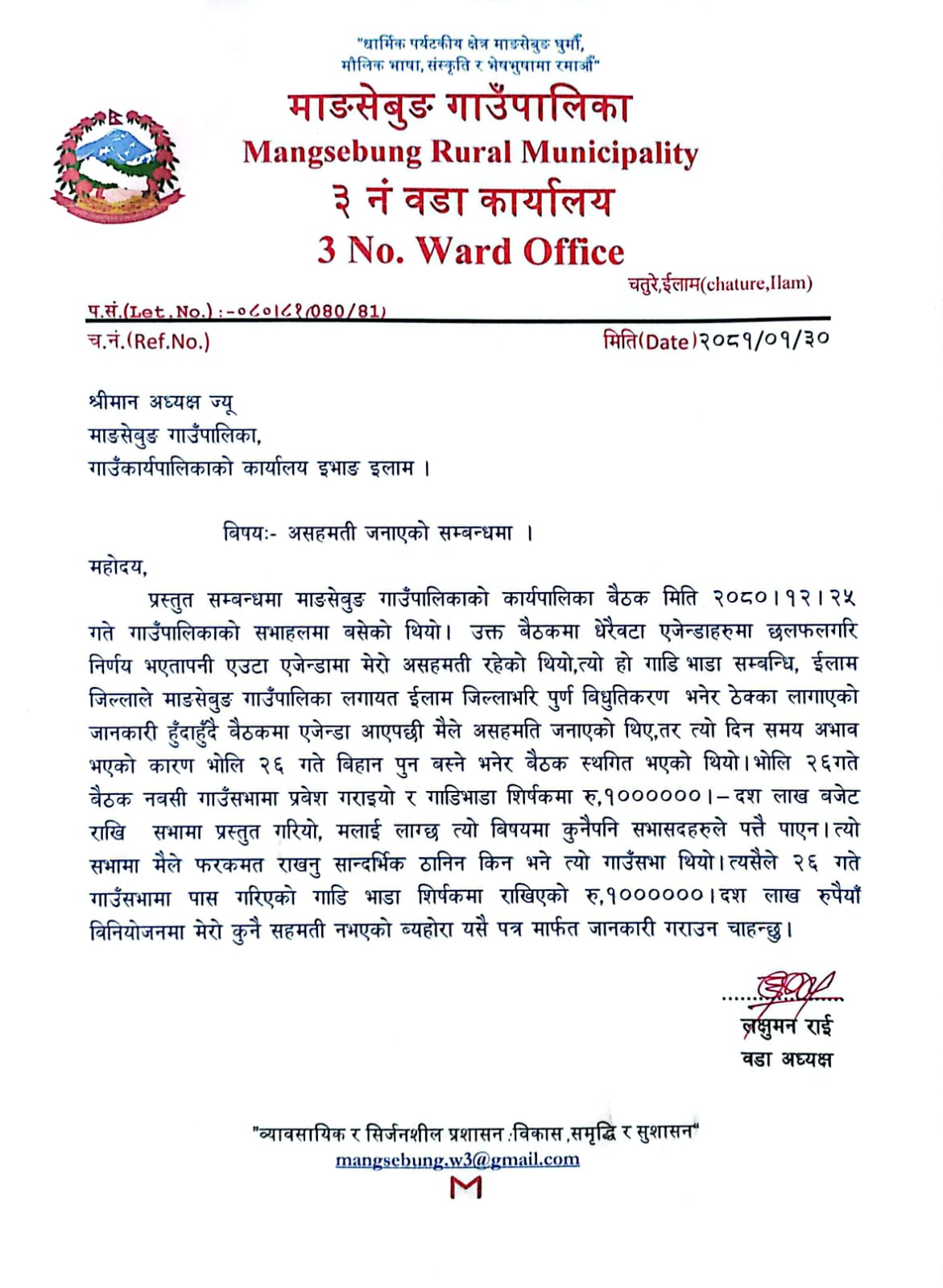 ठेक्का सम्झौताभित्र पर्ने सामग्री ढुवानी भाडाका लागि गाउँसभाबाट रकम विनियोजन भएपछि ३ नं. वडा अध्यक्ष लक्षुमन राई जनमले असहमति जनाउनुभएको हो । माङसेबुङ गाउँपालिकासहित इलाम र पाँचथरमा पूर्ण विद्युतीकरणको ठेक्का पारेको भगवती रेनु जेभीलाई सहयोग पुग्ने गरी माङसेबुङ गाउँपालिकाले बजेट विनियोजन गरेपछि विरोध सुरु भएको हो ।