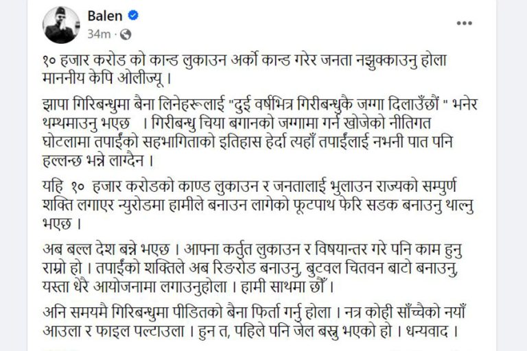 गिरीबन्धु चिया बगानको जग्गामा भएको नीतिगत भ्रष्टाचारमा ओलीको संलग्नता नहोला भन्न नसकिने बालेनको आशय छ । ‘१० हजार करोडको काण्ड लुकाउन अर्काे काण्ड गरेर जनता नझुक्काउनु होला माननीय केपी ओलीज्यू,’ बालेनले लेखेका छन्, ‘गिरीबन्धु चिया बगानको जग्गामा गर्न खोजेको नीतिगत घोटलामा तपाईंको सहभागिताको इतिहास हेर्दा त्यहाँ तपाईंलाई नभनी पात पनि हल्लन्छ भन्ने लाग्दैन ।’