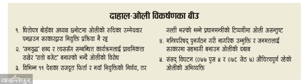तीन महिनाअघि नयाँ गठबन्धन बने पनि प्रधानमन्त्री दाहाल र एमाले अध्यक्ष ओलीबीचको सम्बन्ध चिसो हुँदै आएको छ । मूलतः धितोपत्र बोर्ड ९सेबोन० का अध्यक्ष नियुक्त गर्ने प्रक्रियामा पनि दुई नेताबीच टकराव नै बनेको छ । ओलीले अघि सारेका उम्मेदवारलाई अध्यक्ष बनाउनुपर्ने दबाब बढेपछि प्रधानमन्त्री दाहालले आफूनिकटका तीन जनालाई अन्तर्वार्तामा जान नदिएको एमाले पक्षको आरोप छ । कार्यविधिअनुसार तीन जनाको नाम पठाउनुपर्नेमा अन्तर्वार्तामा दुई जना मात्र सहभागी भएकाले सरकारले नियुक्ति प्रक्रिया नै रद्द गरेको छ । ओलीले यसैतर्फ संकेत गर्दै आइतबार एक कार्यक्रममा भने, ‘मैले सरकारतिर प्रधानमन्त्रीज्यूलाई पनि भनेको छु– हामी सानातिना नियुक्ति, सरुवा, के जाति बढुवामा नअल्झिऊँ, पोलिसी म्याटरमा जाऊँ, छलफलमा जाऊँ ।’