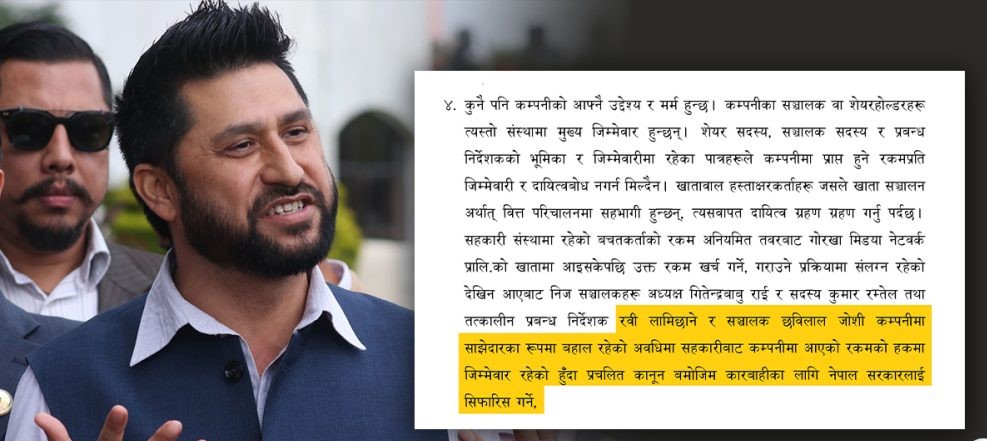 प्रतिवेदनमा उल्लेख छ : ‘‍‍‍‍….सहकारी संस्थामा रहेको बचतकर्ताको रकम अनियमित तवरबाट गोर्खा मिडिया नेटवर्क प्रालिको खातामा आइसकेपछि उक्त रकम खर्च गर्ने, गराउने प्रक्रियामा संलग्न रहेको देखिन आएबाट निज सञ्चालकहरू अध्यक्ष गितेन्द्रबाबु राई र सदस्य कुमार रम्तेल तथा तत्कालीन प्रबन्ध निर्देशक रवि लामिछाने र सञ्चालक छविलाल जोशी कम्पनीमा साझेदारका रूपमा बहाल रहेको अवधिमा सहकारीबाट कम्पनीमा आएको रकमको हकमा जिम्मेवार रहेको हुँदा प्रचलित कानून बमोजिम कारबाहीका लागि नेपाल सरकारलाई सिफारिस गर्ने ।’
